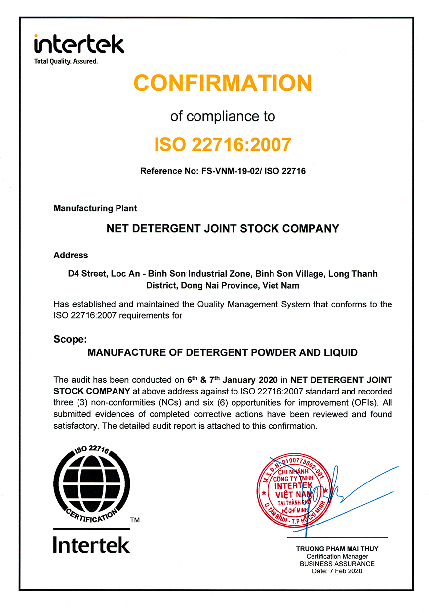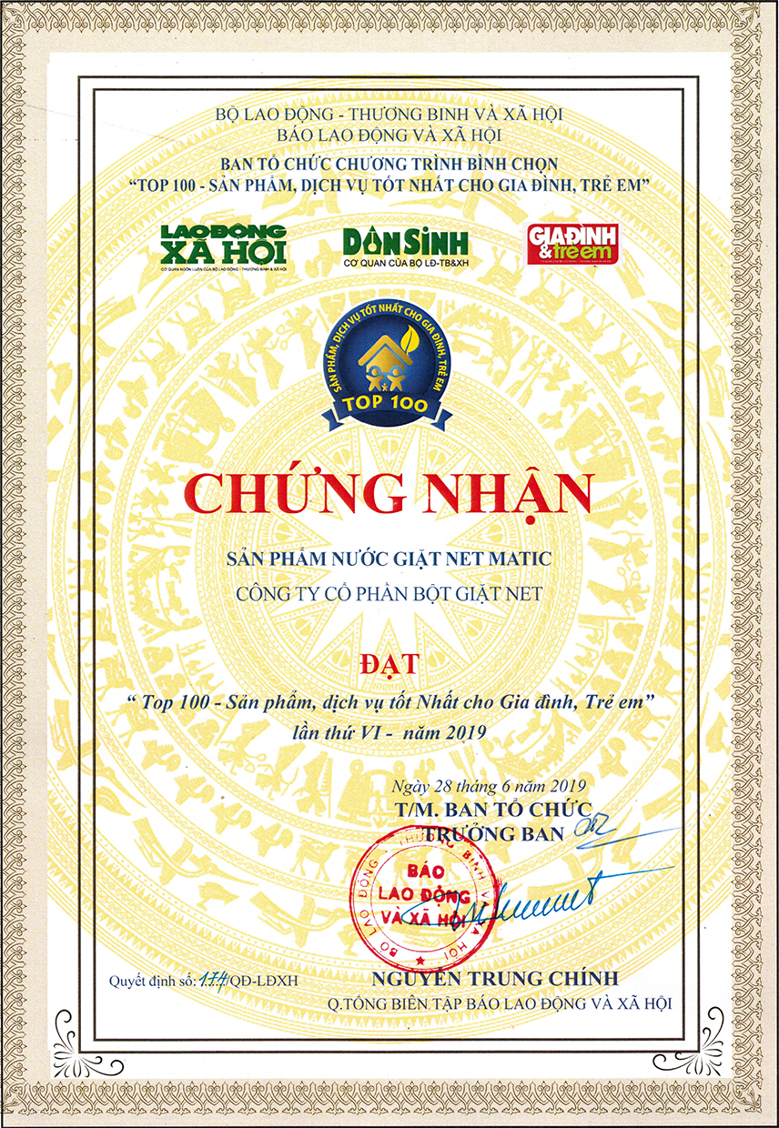 Giấy chứng nhận đạt danh hiệu Xanh-Sạch-Đẹp, đảm bảo an toàn vệ sinh lao động, do Liên đoàn lao động tỉnh Đồng Nai cấp.